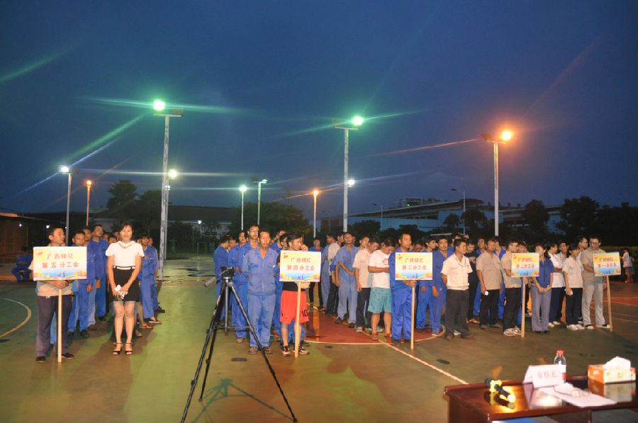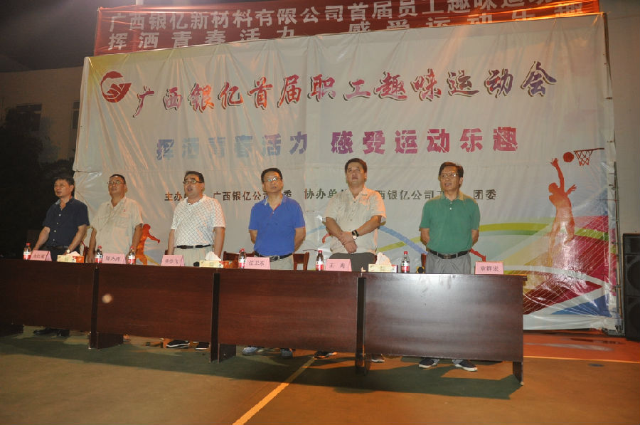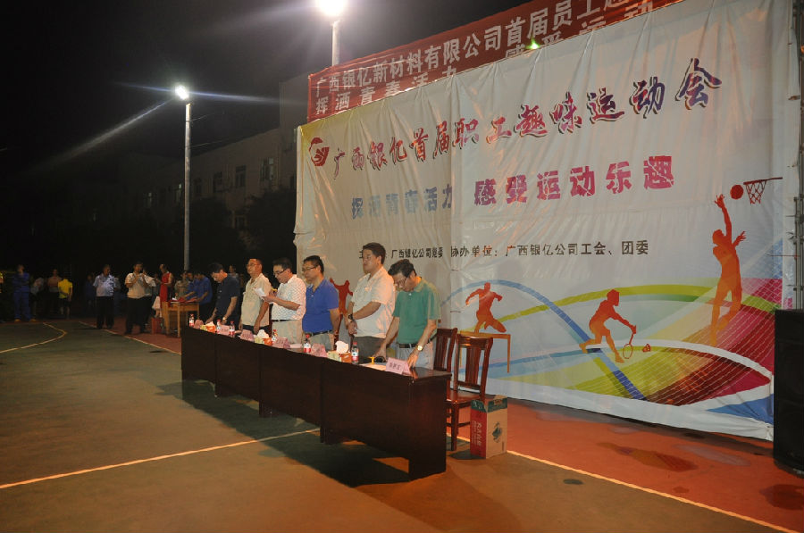 2017年9月22日晚,廣西銀億首屆職工趣味運動會勝利閉幕。晚7:00,閉幕式在廣西銀億燈光球場舉行,廣西銀億常務副總經理張學飛、副總經理任衛(wèi)東、副總經理陳為清、副總經理朱紅斌、集團新材料事業(yè)部副總王海、工會主席章群宏參加。參賽運動員在分工會的牌子引領下,成十列縱隊入場,五個分工會的參賽運動員依次并排列隊,整齊站在球場。